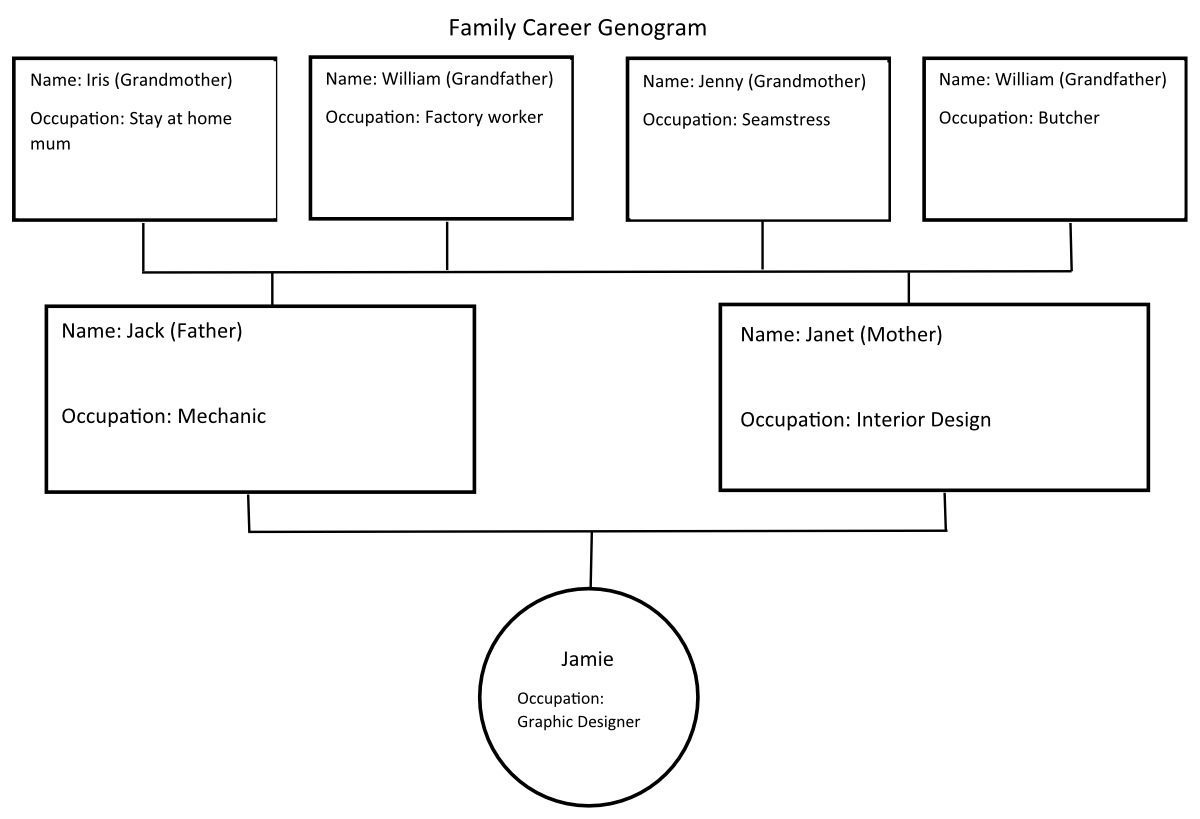 The following diagram captures the occupations of key family members and offers insight into the “values that are manifest and the family’s conceptualization of career success” (Yates, 2021, p. 285).