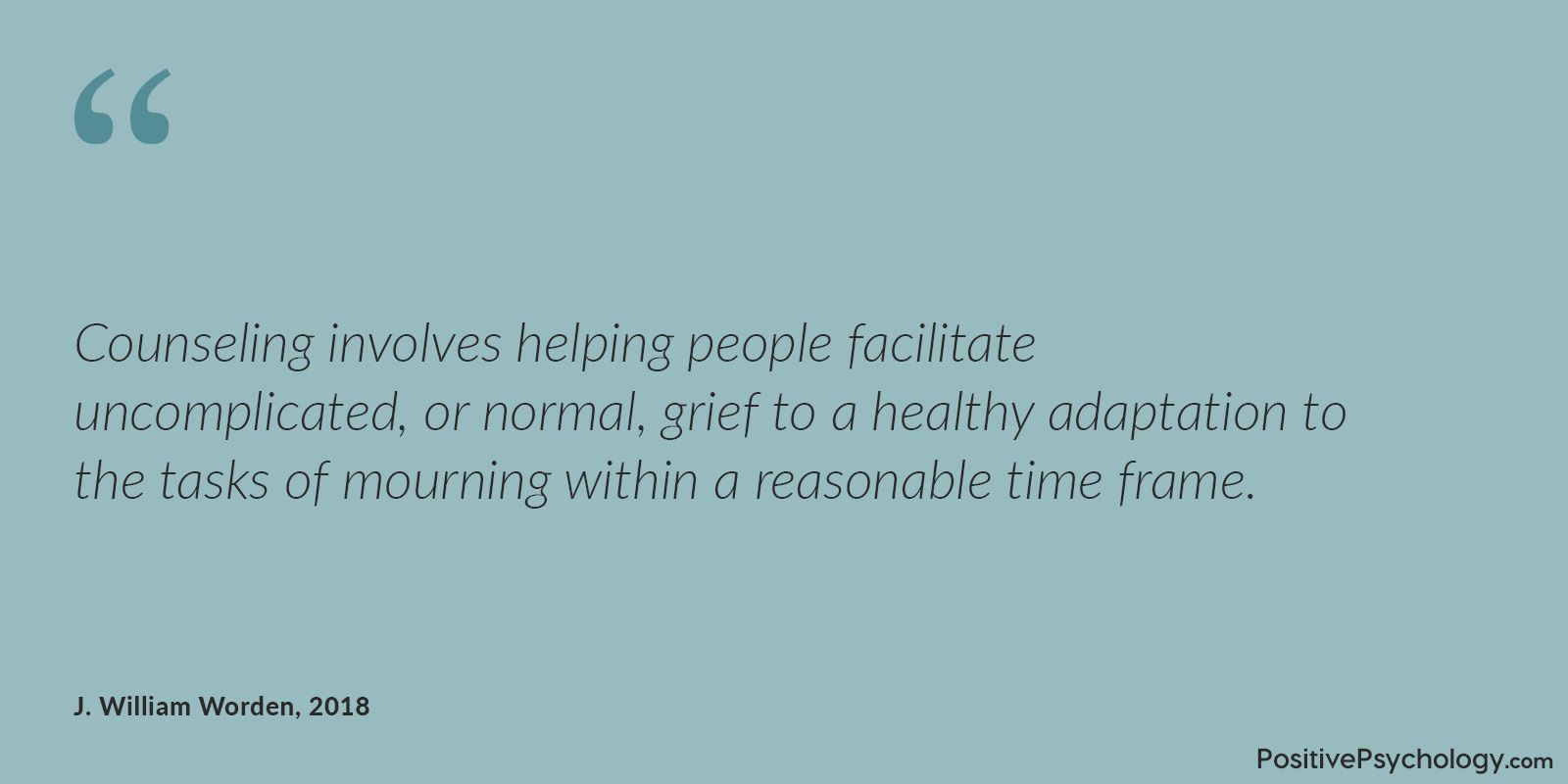 Counseling involves helping people facilitate uncomplicated, or normal, grief to a healthy adaptation to the tasks of mourning within a reasonable time frame.